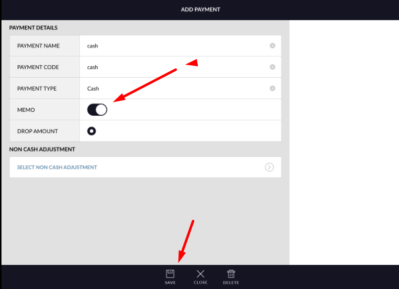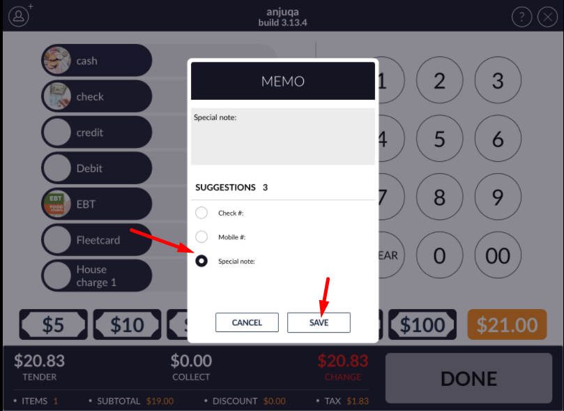 - Keep tender type memo option off.