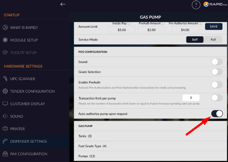 - There is one option available ‘auto authorization pump upon request’, When this option is ON and pump
