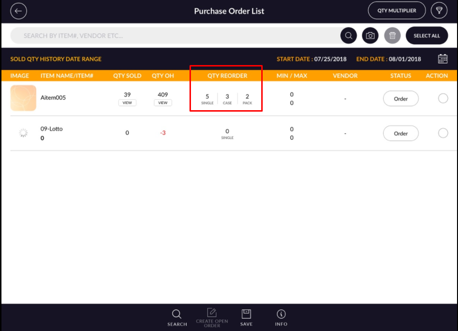 - There should be one column for entering qty for reorder. If in item case/pack define then qty reorder display in form of single/case/pack and if case/pack does not define then the only field for single is display.