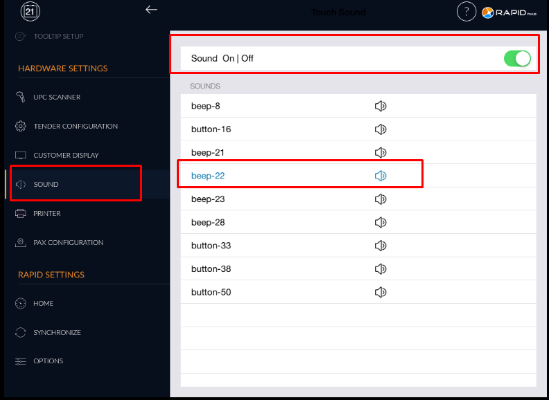 How sound ON/OFF from setting for rapid?