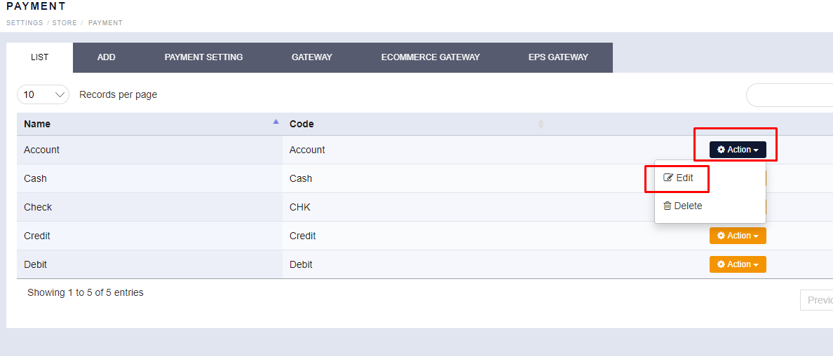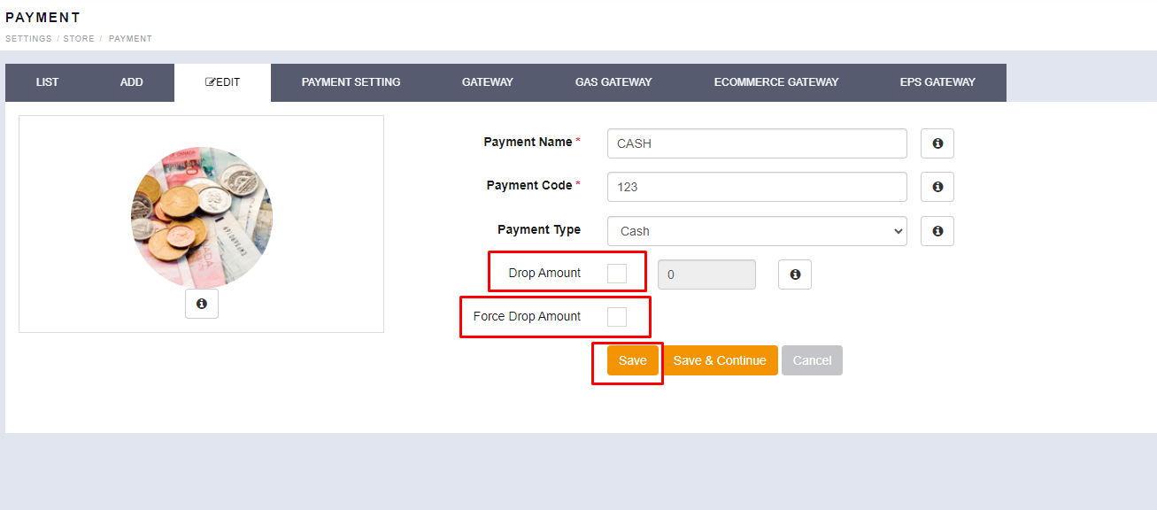 - Scroll to see the “PAYMENT TYPE” option. You will find your existing list of Tender.