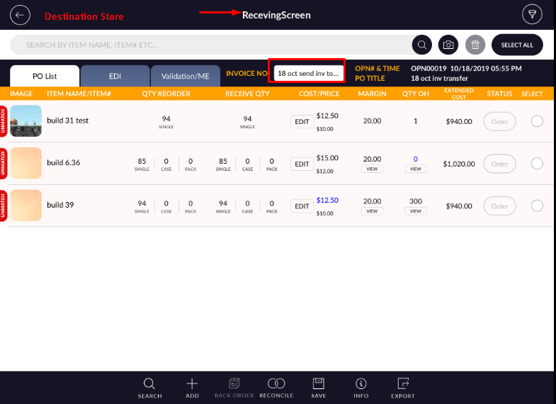 - Now from Receiving Screen of destination store Reconcile Order when destination store receive qty.