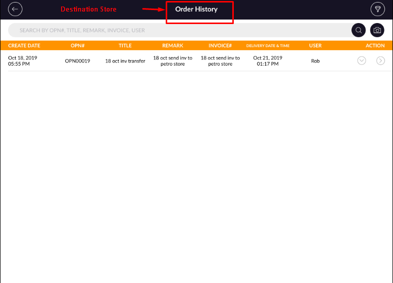 Order History of destination store.