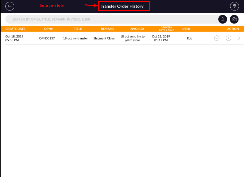In Route Transfer Order List module is used to view order when in destination store order is in receiving