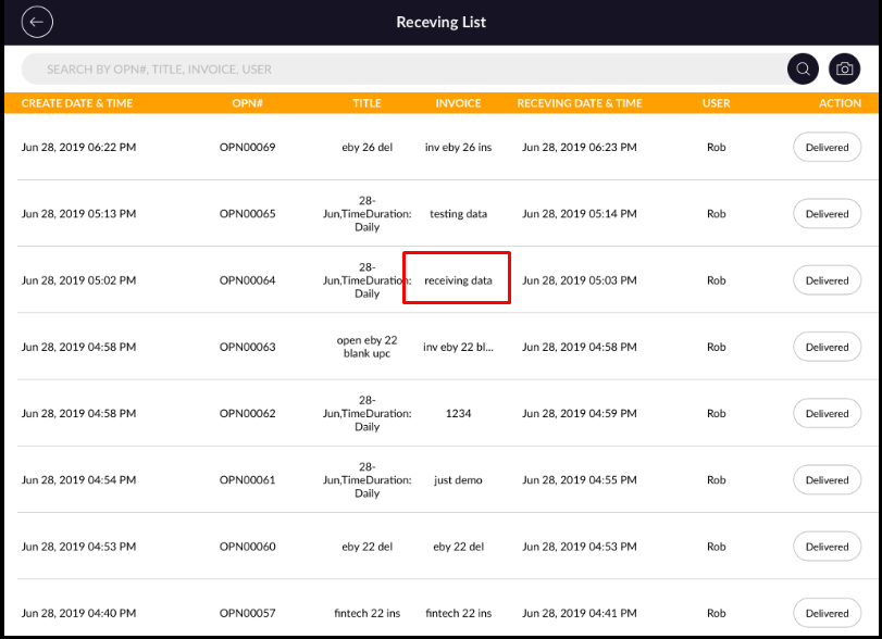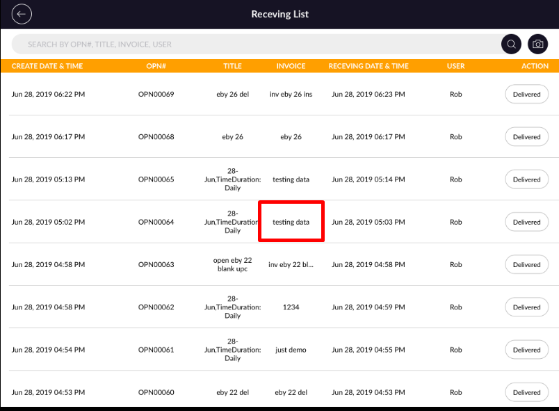 - Orders will display with created date & time, OPN#, title, invoice, delivery date & time, user and Action.
