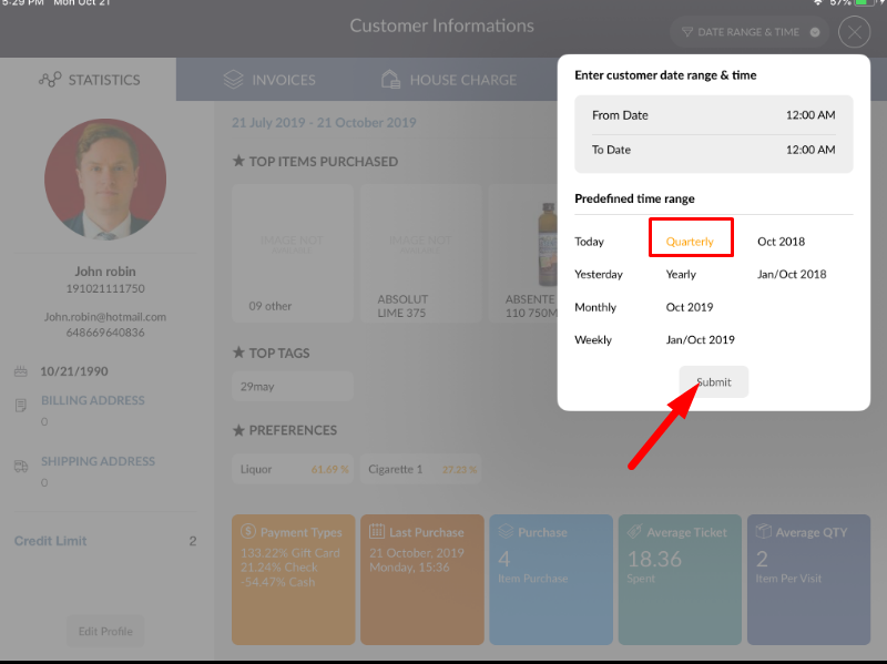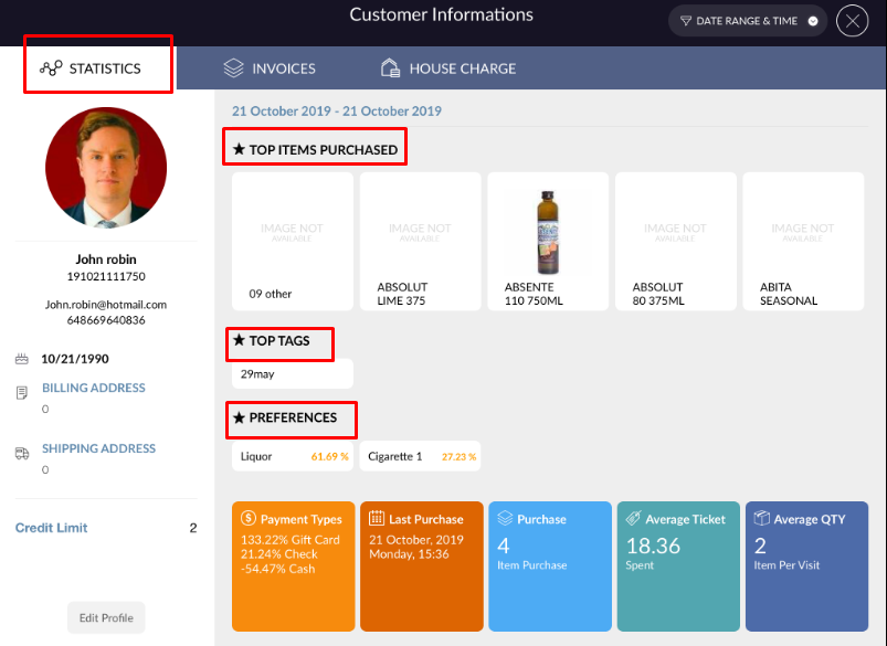 - In the statistics section, all the detail of items which are sold to this customer will display.