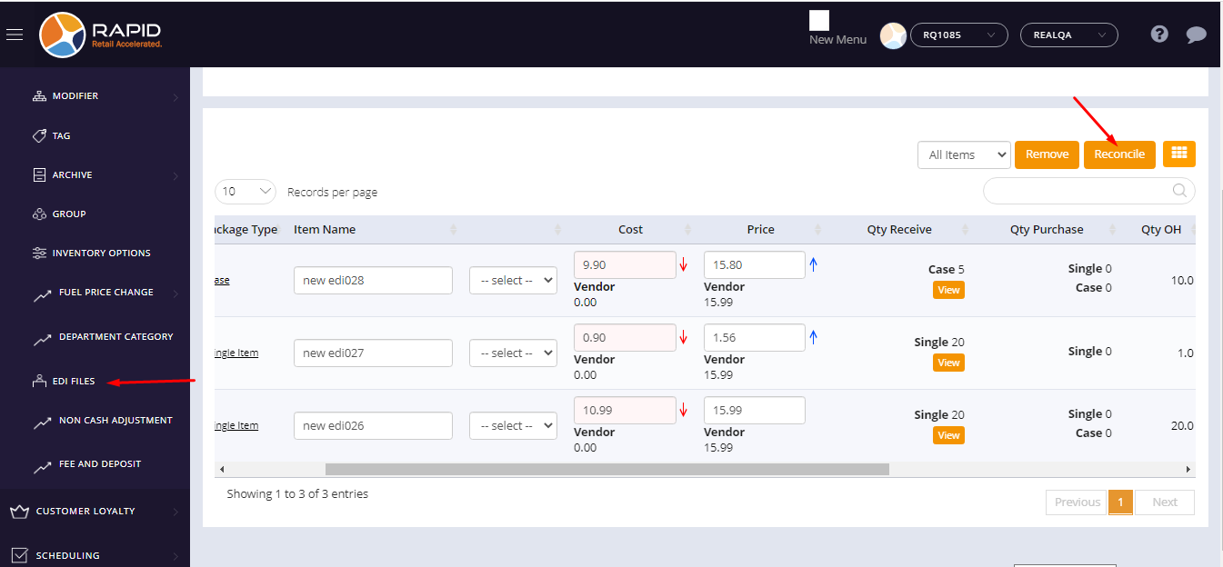 - After import the edi file, the page would be redirected to the reconcile page.