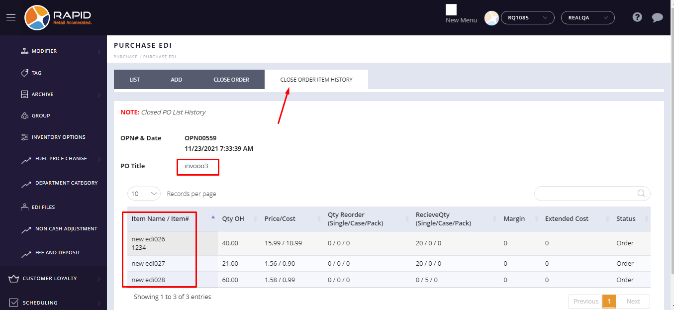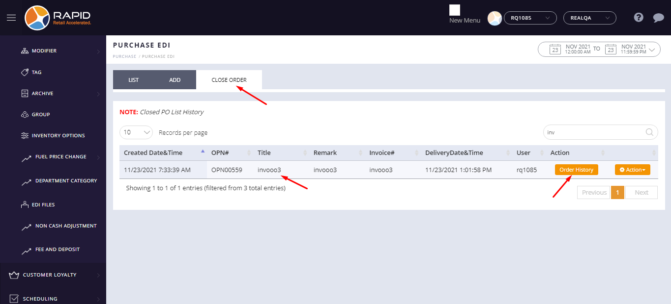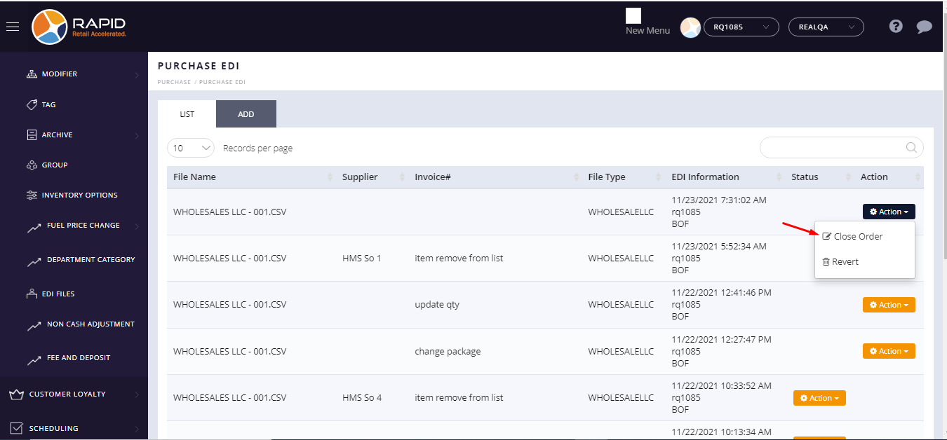 After the reconcile EDI file store can check close order history.